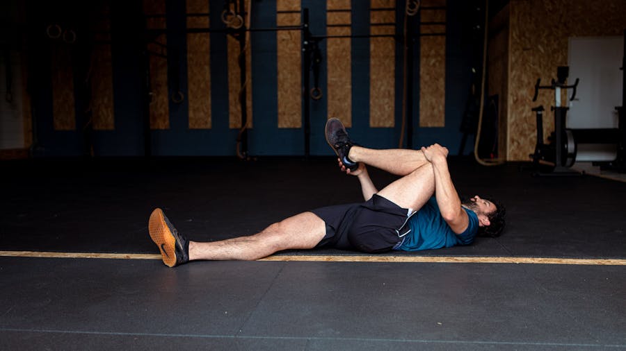 - À l'aide de l'autre main, ramenez votre pied gauche vers le côté droit de votre hanche tout en gardant le dos et la jambe droite à plat sur le sol