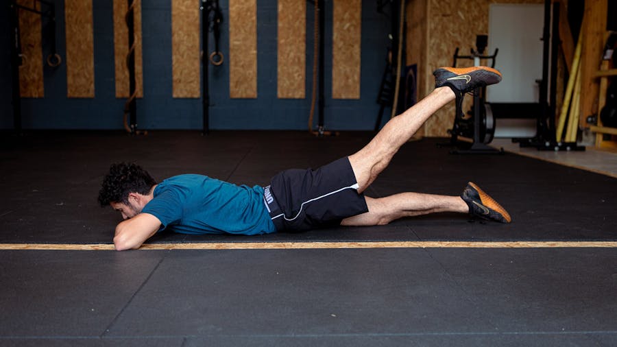 - Allongé sur le ventre, la tête reposée sur vos mains, levez votre jambe gauche de quelques centimètres.