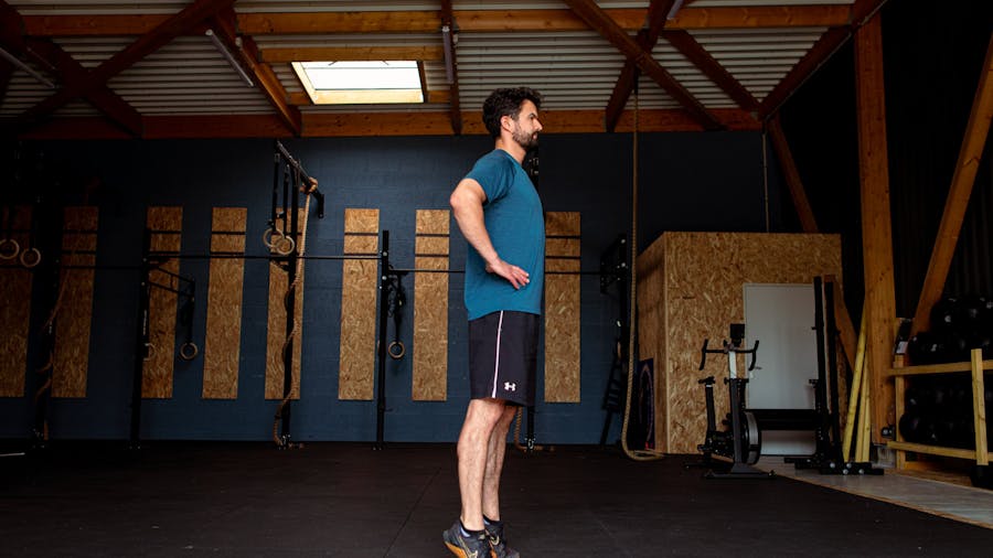 - Debout, les pieds à largeur d'épaules, les mains sur la taille.